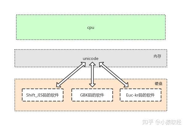 #2. 与传统的字符编码的二进制数都有对应关系,详解如下很多地方或老的系统、应用软件仍会采用各种各样传统的编码,这是历史遗留问题。此处需要强调:软件是存放于硬盘的,而运行软件是要将软件加载到内存的,面对硬盘中存放的各种传统编码的软件,想让我们的计算机能够将它们全都正常运行而不出现乱码,内存中必须有一种兼容万国的编码,并且该编码需要与其他编码有相对应的映射/转换关系,这就是unicode的第二大特点产生的缘由